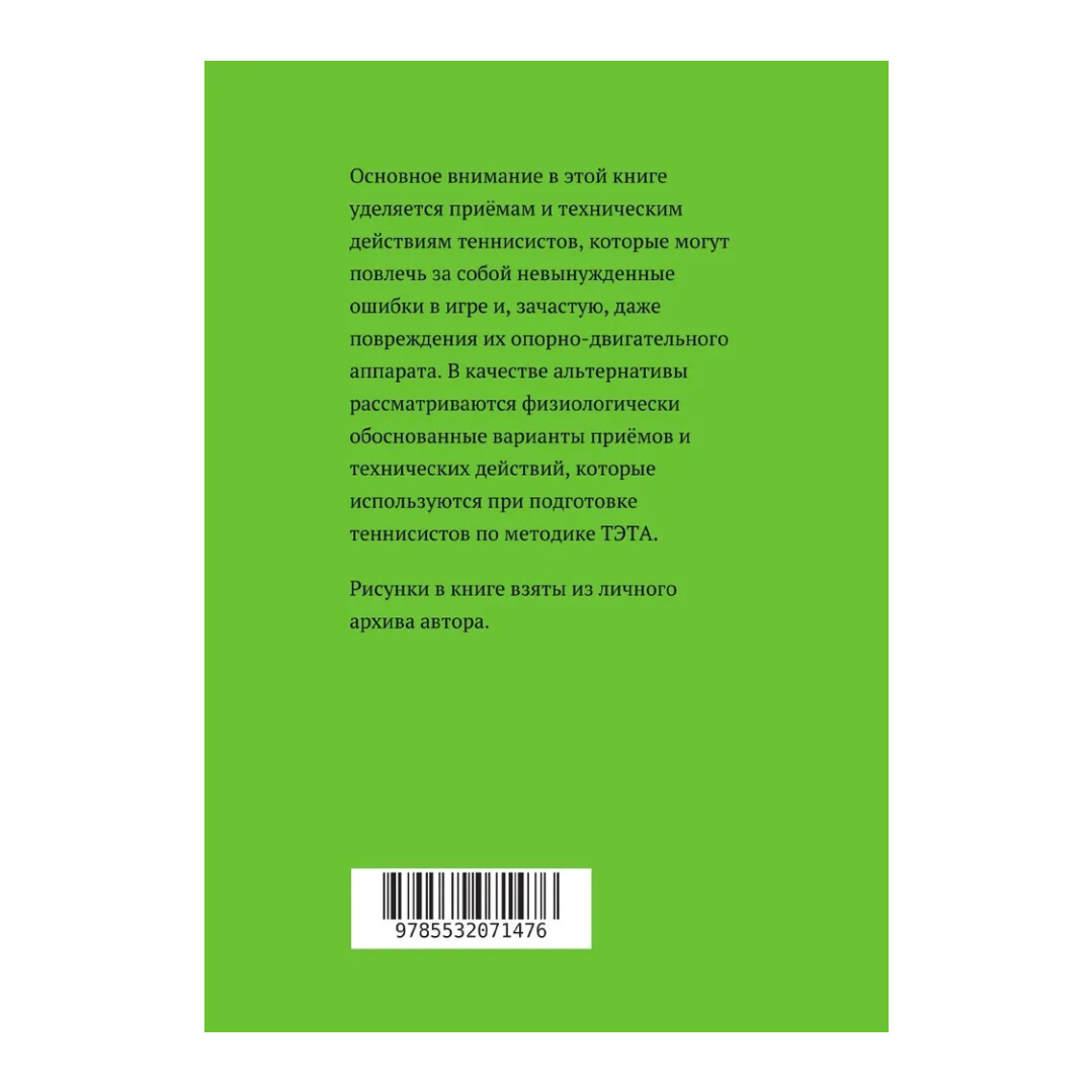 Основное внимание в этой книге уделяется приёмам и техническим действиям теннисистов, которые могут повлечь за собой невынужденные ошибки в игре и, зачастую, даже повреждения их опорно-двигательного аппарата. В качестве альтернативы рассматриваются физиологически обоснованные варианты приёмов и технических действий, которые используются при подготовке теннисистов по методике ТЭТА.Рисунки в книге взяты из личного архива автора.