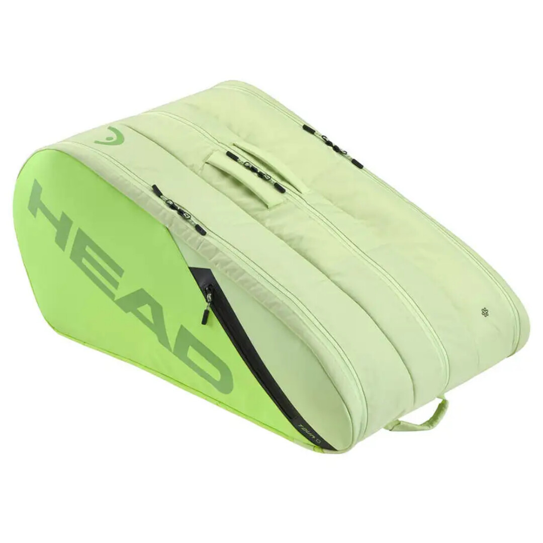 Сумка для ракеток Head Tour Racquet Bag XL SG салатового цвета создана для тех, кому необходимо организованно и уверенно переносить все свое снаряжение. Ее огромная вместимость позволяет перевозить до 15 ракеток, что делает ее идеальным выбором для игроков-спортсменов или для интенсивных тренировок, требующих порядка, прочности и быстрого доступа.
